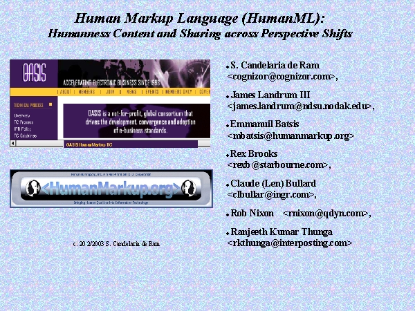 Human Markup Language (HumanML) is being developed by the huml team. Its goal is to help keep the intended meaningfulness in electronic communication, in spite of geotemporal separations – remoteness.