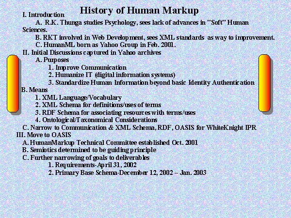 Taking hold, the group decided to work through OASIS to set up an XML standard that can be used everywhere, anytime. Called HumanML, its tags can be pulled into your document, and their definitions known to everybody. Computer programs can process the HumanML markup tags dispersed to show what the document is for, and why [each part of] it was written, and what authors are assuming you will know so you can interpret it the way they meant it.